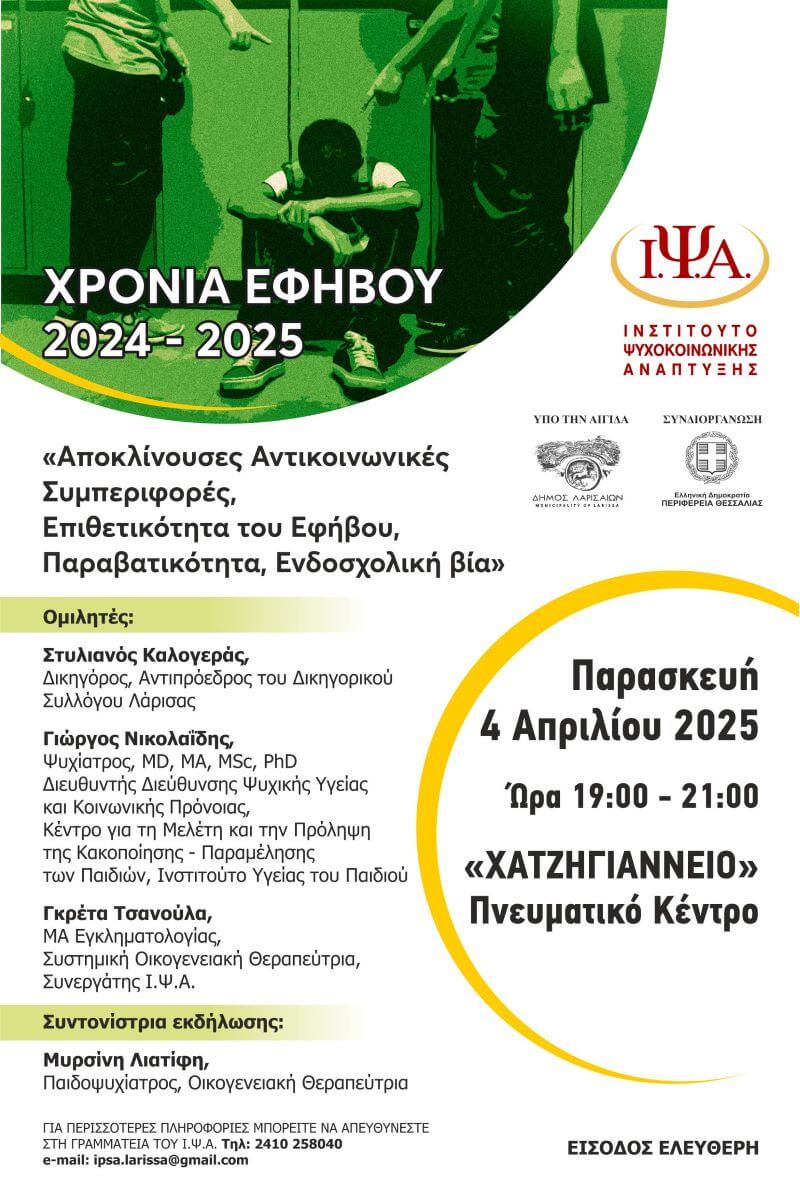 Η Περιφέρεια Θεσσαλίας, σε συνεργασία με το Ινστιτούτο Ψυχοκοινωνικής Ανάπτυξης (Ι.Ψ.Α.) και τον Δήμο Λαρισαίων, συνεχίζοντας τον Κύκλο Ομιλιών για το έτος 2024-2025 με κύριο θέμα την Εφηβεία, πραγματοποιεί την πέμπτη ημερίδα με τίτλο «Αποκλίνουσες Αντικοινωνικές Συμπεριφορές, Επιθετικότητα του Εφήβου, Παραβατικότητα, Ενδοσχολική Βία» την Παρασκευή 4 Απριλίου 2025, και ώρα 19:00 στο «Χατζηγιάννειο» Πνευματικό Κέντρο Δήμου Λαρισαίων.