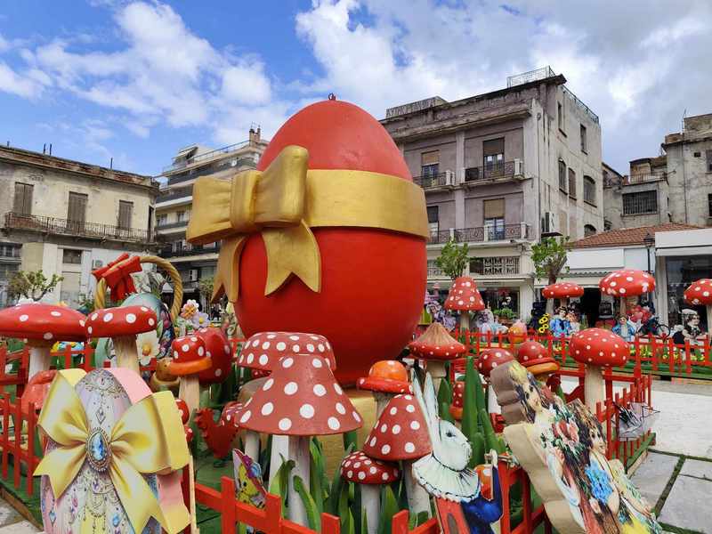 Περιμετρικά της πλατείας Πανεπιστημίου ο επισκέπτης μπορεί να απολαύσει χειροποίητα γλυπτά, αλλά και αναπαραγωγές φιγούρων από πασχαλινές κάρτ ποστάλ που δημιουργήθηκαν στα τέλη του 19ου αιώνα και στις αρχές του 20ου αιώνα, μικρά κομμάτια τέχνης, νοσταλγίας και ιστορίας με γοητευτικές εικονογραφήσεις και εκπληκτικά γραφικά. Ολόκληρη η διαδικασία σχεδιασμού και κατασκευής ήταν έργο διάρκειας 4 μηνών που πραγματοποιήθηκε από την εταιρεία θεματικών πάρκων Artheme.