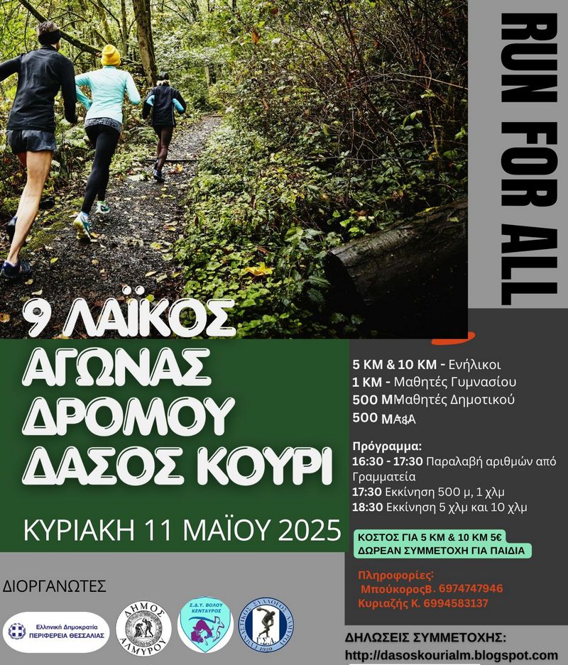 Για το απόγευμα της 11ης Μαΐου προγραμματίστηκε η διεξαγωγή του καθιερωμένου αγώνα δρόμου στο Κουρί που αποτελεί θεσμό στα αθλητικά δρώμενα της περιοχής μας και η φετινή θα είναι η ένατη εκδοχή του. Διοργανώνεται από τον Σύλλογο Φίλων Δάσους Κουρί, σε συνεργασία με την Περιφέρεια Θεσσαλίας, τον Δήμο Αλμυρού, τον Σύλλογο Δρομέων Υγείας Βόλου «Κένταυρος» και τον Γυμναστικό Σύλλογο Αλμυρού-Τμήμα Στίβου.