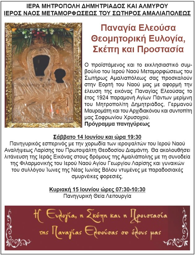 Ο προϊστάμενος και το εκκλησιαστικό συμβούλιο του Ιερού Ναού Μεταμορφώσεως του Σωτήρως Αμαλιαπόλεως σας προσκαλούν στην Εορτή του Ναού μας με αφορμή την έλευση της εικόνας Παναγίας Ελεούσας το έτος 1924 παραμονή Αγίων Πάντων μερίμνη του Μητροπολίτη Δημητριάδος, Γερμανού Μαυρομάτη και του Αρχιδιακόνου και συντοπίτη μας Σοφρωνίου Χρυσοχού.