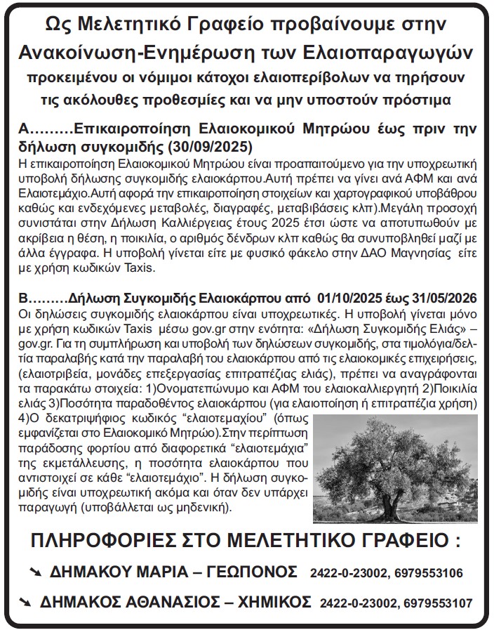 ΑΓΡΟΤΙΚΑ 13 Ιουνίου, 2025 Μαρία Δήμακου: Ανακοίνωση – Ενημέρωση των Ελαιοπαραγωγών Tags ανακοινωση ενημερωση ελαιοπαραγωγων ΕΛΑΙΟΠΑΡΑΓΩΓΟΙ Μαρία Δημάκου