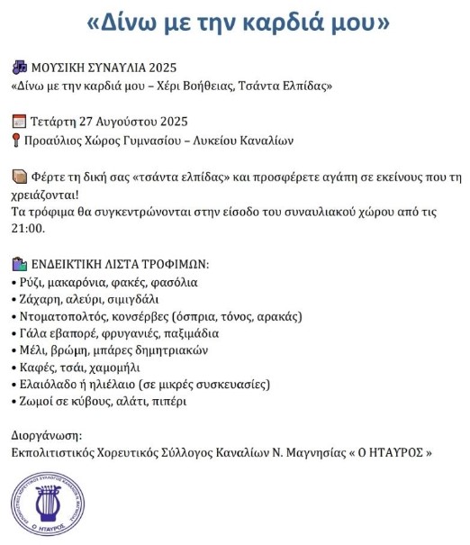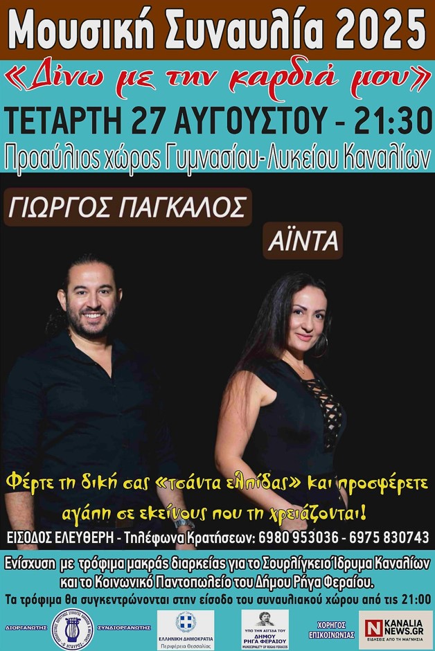 Ο Εκπολιτιστικός Χορευτικός Σύλλογος Καναλίων Ν.Μαγνησίας «Ο ΗΤΑΥΡΟΣ», σε συνεργασία με την Περιφέρεια Θεσσαλίας και τον Δήμο Ρήγα Φεραίου, διοργανώνει τη μεγάλη μουσική εκδήλωση «Δίνω με την καρδιά μου» την Τετάρτη 27 Αυγούστου 2025, στις 21:30, στον προαύλιο χώρο του Γυμνασίου–Λυκείου Καναλίων.