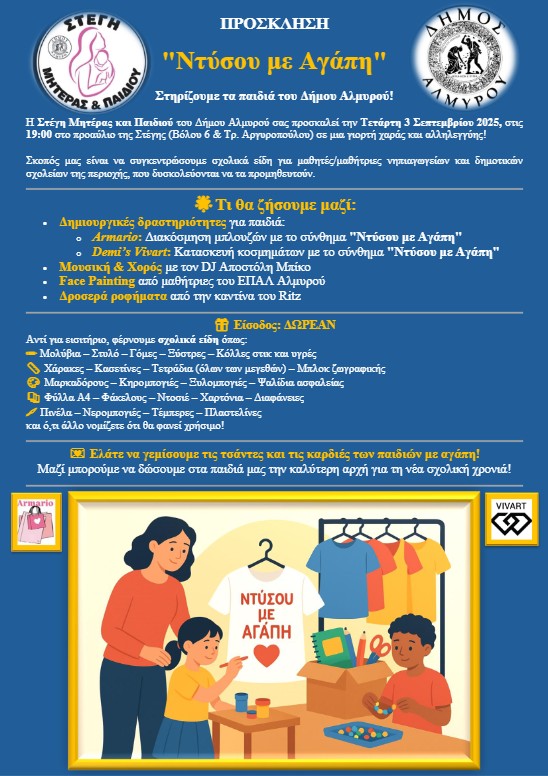 Η Στέγη Μητέρας και Παιδιού του Δήμου Αλμυρού διοργανώνει την Τετάρτη 3 Σεπτεμβρίου 2025 στις 7μμ στο Προαύλιο της Στέγης (Βόλου 6 & Τρ. Αργυροπούλου) μια γιορτή χαράς και αλληλεγγύης, με σκοπό τη συγκέντρωση σχολικών ειδών για τους μαθητές/τριες των Νηπιαγωγείων και Δημοτικών της περιοχής μας, που δυσκολεύονται να τα προμηθευτούν.