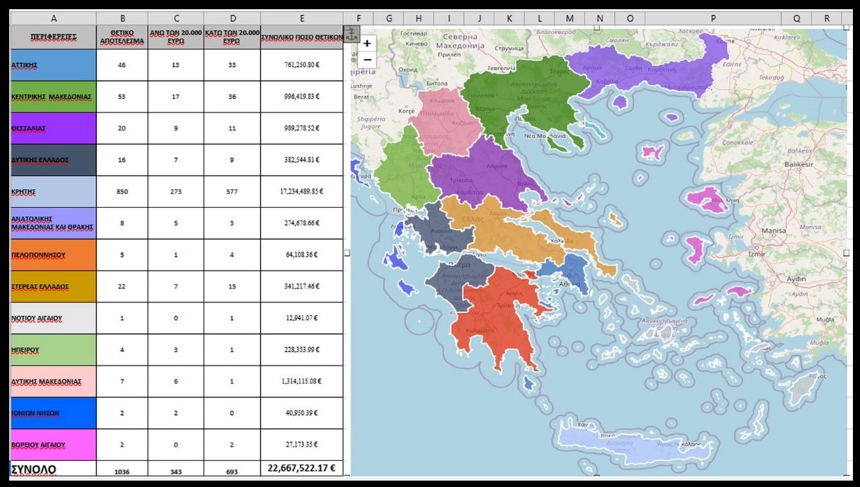 Στην Αττική βρέθηκαν 46 περιπτώσεις (761.250,80 ευρώ), στην Κεντρική Μακεδονία 53 περιπτώσεις (996.419,83 ευρώ), στη Θεσσαλία 20 περιπτώσεις (989.278,52 ευρώ), στη Δυτική Ελλάδα 16 (382.544,81 ευρώ), στην Ανατολική Μακεδονία και Θράκη μόλις 8 περιπτώσεις (274.678,66 ευρώ), στην Πελοπόννησο 5 (64.108.36 ευρώ), στη Στερεά Ελλάδα 22 (341.217,46 ευρώ), στο Νότιο Αιγαίο μία περίπτωση (12.941,07 ευρώ), στην Ήπειρο 4 (228.353,99 ευρώ), στη Δυτική Μακεδονία 7 (1.314.115,08 ευρώ), στην Περιφέρεια Ιόνιων Νήσων 2 περιπτώσεις (40.950.39 ευρώ) και στο Βόρειο Αιγαίο 2 περιπτώσεις (37.173,35 ευρώ).