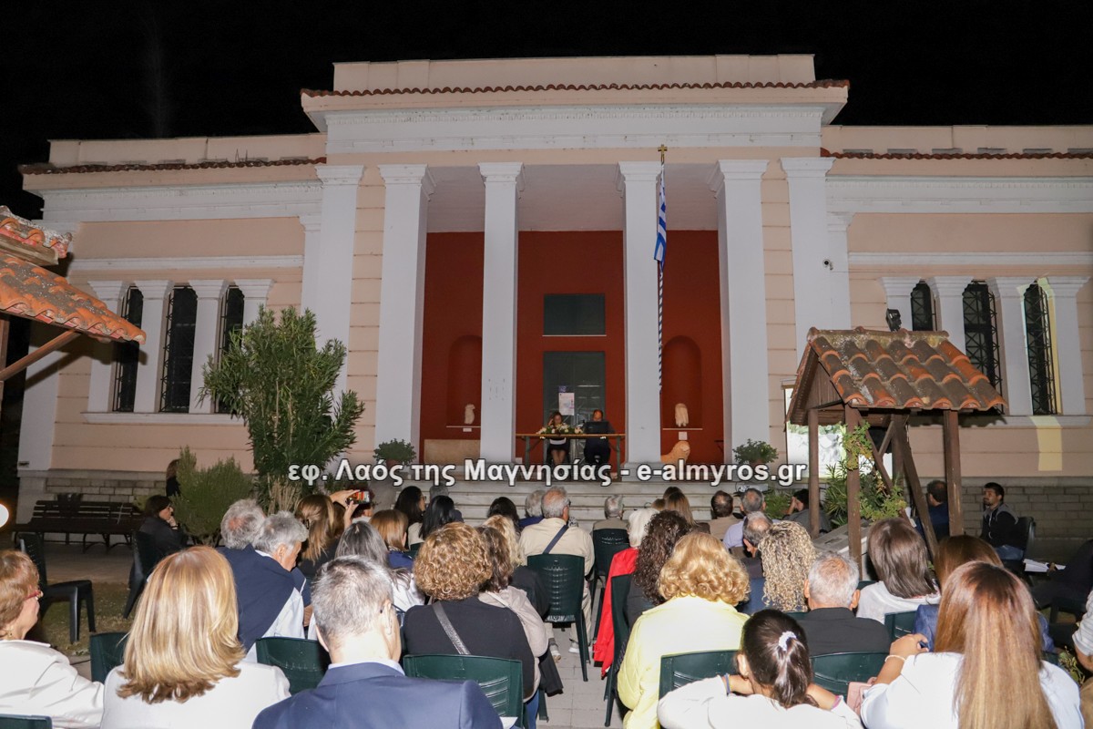 Πριν την έναρξη των ομιλιών, πραγματοποιήθηκε εξαιρετική ξενάγηση στο Μουσείο, από την αρχαιολόγο της Εφορείας Αρχαιοτήτων Μαγνησίας, υπεύθυνη της περιοχής Αλμυρού, κ. Τζένη Ευσταθίου. Η κυρία Έλσα Νικολάου, τμηματάρχης της Εφορείας Αρχαιοτήτων Μαγνησίας και υπεύθυνη της ανασκαφής του αρχαίου θεάτρου, μετά από σύντομη εισαγωγή, έδωσε τον λόγο στον γράφοντα το παρόν κείμενο, ο οποίος μίλησε για τη διαχρονική σχέση μεταξύ των Φθιωτίδων Θηβών και της Φιλαρχαίου Εταιρείας.