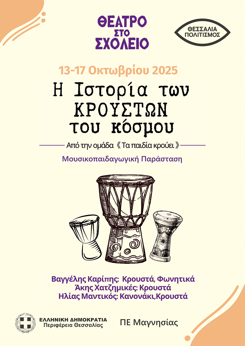 Η Περιφέρεια Θεσσαλίας υποστηρίζει με θέρμη τις πολιτιστικές δράσεις για παιδιά και σχεδιάζει με συνέπεια εξαιρετικής ποιότητας εκδηλώσεις. Στο πλαίσιο αυτό, η ομάδα «Τα Παιδία Κρούει», που αποτελείται από διεθνούς εμβέλειας μουσικούς, παρουσιάζει την Ιστορία των Κρουστών του Κόσμου για σχολεία στην Π.Ε. Μαγνησίας.