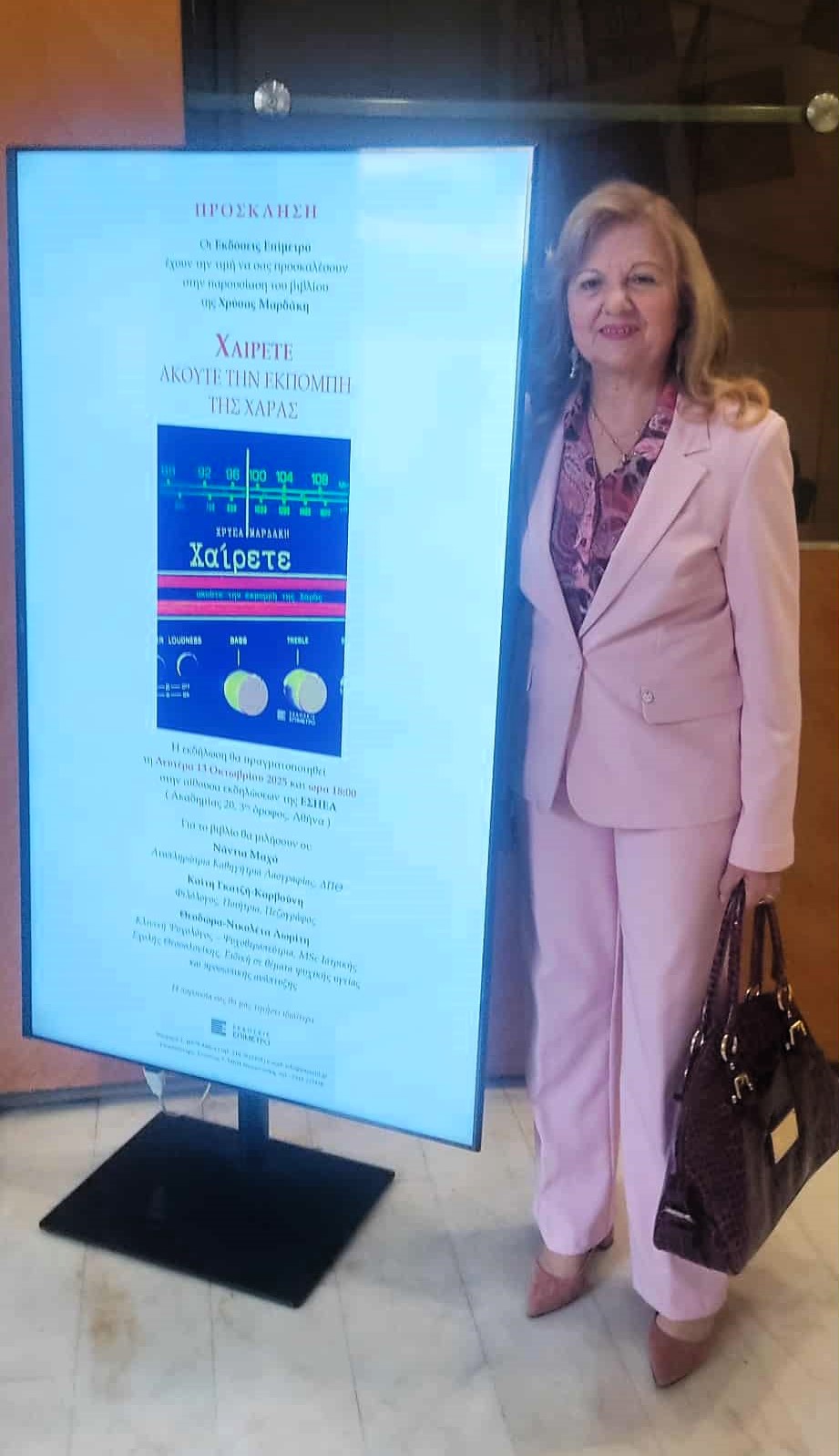 Την Δευτέρα 13 Οκτωβρίου, στην αίθουσα εκδηλώσεων της ΕΣΗΕΑ (Ένωση Συντακτών Ημερησίων Εφημερίδων), οι Εκδόσεις Επίμετρο του Εκδοτικού Οίκου Παπαζήσης παρουσίασαν το βιβλίο της Χρύσας Μαρδάκη «Χαίρετε, Ακούτε την εκπομπή της Χαράς». Το κοινό που με αμείωτο ενδιαφέρον παρακολούθησε την βιβλιοπαρουσίαση, είχε την ευκαιρία να ακούσει και να συμμετάσχει, με ερωτήσεις και σχόλια, σε μια ιδιαίτερη και συγκινητική εκδήλωση, αφιερωμένη ολόκληρη στη χαρά της ζωής, που τόσο έχουμε όλοι ανάγκη.