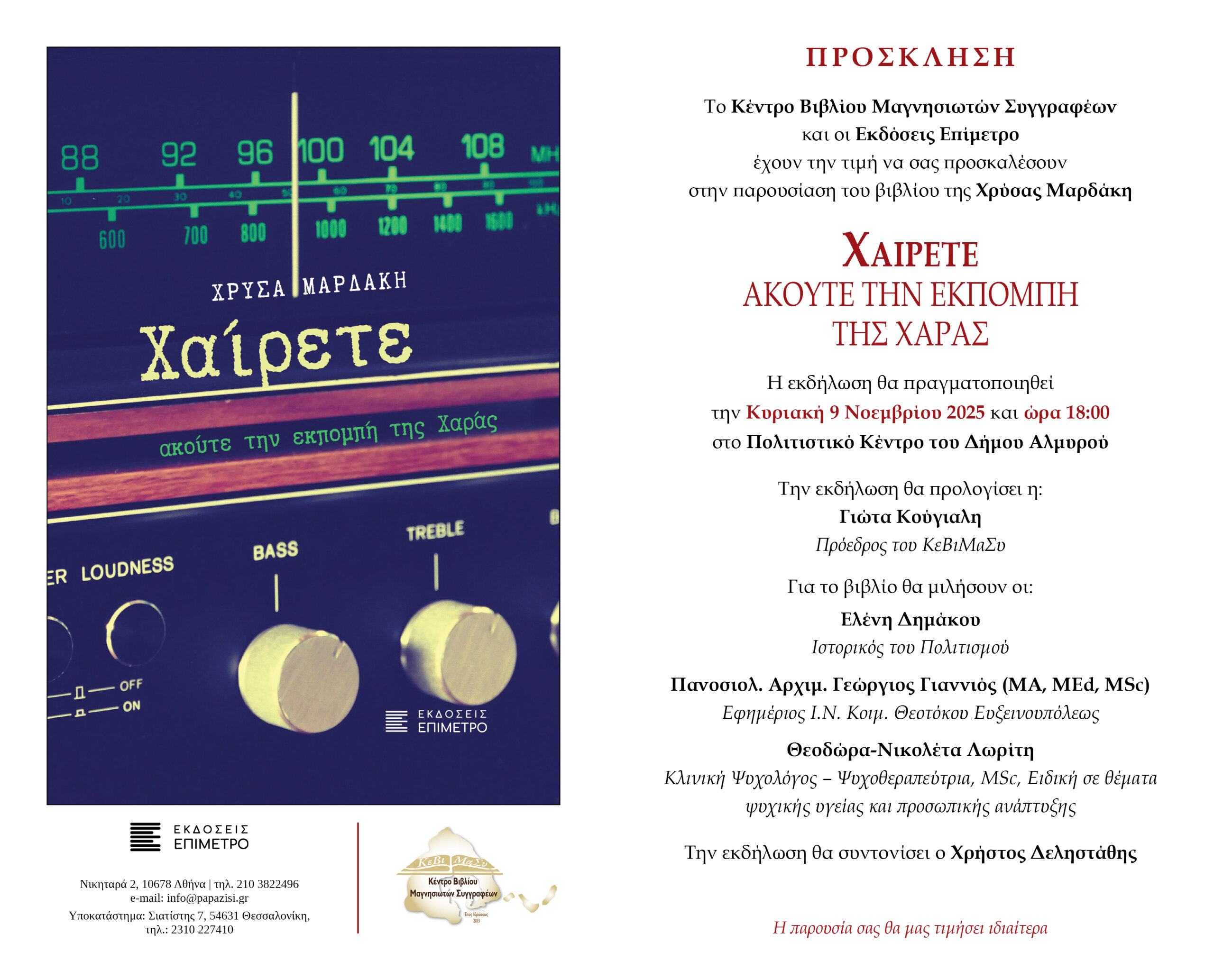 Το Κέντρο Βιβλίου Μαγνησιωτών Συγγραφέων και οι Εκδόσεις Επίμετρο έχουν την τιμή να σας προσκαλέσουν στην παρουσίαση του βιβλίου της Χρύσας Μαρδάκη “Χαίρετε Ακούτε την Εκπομπή της Χαράς”. Η εκδήλωση θα πραγματοποιηθεί την Κυριακή 9 Νοεμβρίου 2025 και ώρα 18:00 στο Πολιτιστικό Κέντρο του Δήμου Αλμυρού.