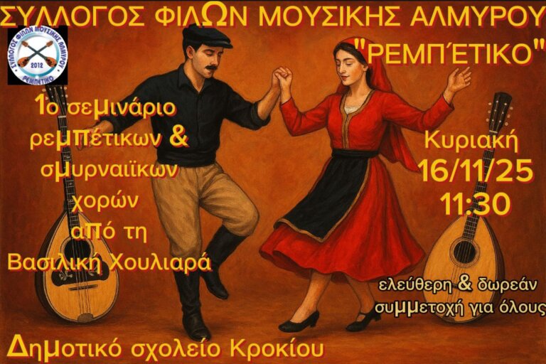 Ο Σύλλογος Φίλων Μουσικής Αλμυρού “Ρεμπέτικο” διοργανώνει δωρεάν σεμινάρια, αποκλειστικά ρεμπέτικων και σμυρναίικων χορών. Το πρώτο σεμινάριο θα γίνει την Κυριακή 16 Νοεμβρίου από τις 11:30 έως 13:00, στο δημοτικό σχολείο Κροκίου. Η συμμετοχή είναι ελεύθερη για όλους, μικρούς και μεγάλους. Τα σεμινάρια θα γίνουν χορηγία προς τον σύλλογο από την δασκάλα χορού Βασιλική Χουλιαρά. “Σας … Συνεχίστε να διαβάζετε το Σεμινάρια ρεμπέτικων και σμυρναίικων χορών.