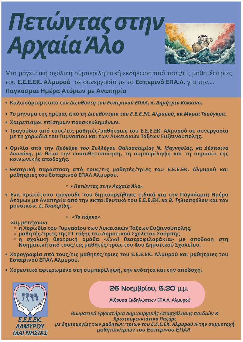 Μαθητές και μαθήτριες πέντε σχολικών μονάδων ενώνουν τις φωνές τους σε μια σχολική συμπεριληπτική εκδήλωση που θα πραγματοποιηθεί την ερχόμενη Τετάρτη 26 Νοεμβρίου και ώρα 18:30 στην αίθουσα εκδηλώσεων του ΕΠΑΛ Αλμυρού. Πρόκειται για μια συνεργασία του Ε.Ε.Ε.Ε.Κ. Αλμυρού με το Εσπερινό ΕΠΑ.Λ. για την Παγκόσμια Ημέρα Ατόμων με Αναπηρία, με την συμμετοχή επίσης μαθητών-τριών από το 4ο Δημοτικό Σχολείο, το Δημοτικό Σούρπης και το Γυμνάσιο-Λ.Τ. Ευξεινούπολης.