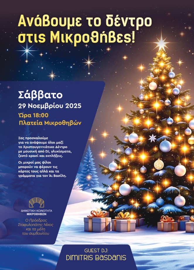 Το Άναμμα του Χριστουγεννιάτικου Δένδρου στις Μικροθήβες αποτελεί κάθε χρόνο μια ξεχωριστή γιορτή που γεμίζει το χωριό με φως, μουσική και χαμόγελα!!! Μικροί και μεγάλοι συγκεντρώνονται στην κεντρική πλατεία για να διασκεδάσουν και να υποδεχτούν την εορταστική περίοδο… Είναι μια όμορφη γιορτή που επιμελείται τα τελευταία έτη η τοπική κοινότητα και φέτος θα πραγματοποιηθεί το βράδυ του Σαββάτου 29 Νοεμβρίου. Ο πρόεδρος Νίκος Σταφυλοπάτης προσκαλεί τους κατοίκους των Μικροθηβών, και όχι μόνο, να παρευρεθούν στην εκδήλωση ώστε να ανάψουν όλοι μαζί το Χριστουγεννιάτικο δένδρο, με μουσική από dj, γλυκίσματα, ζεστό κρασί κι άλλες εκπλήξεις…