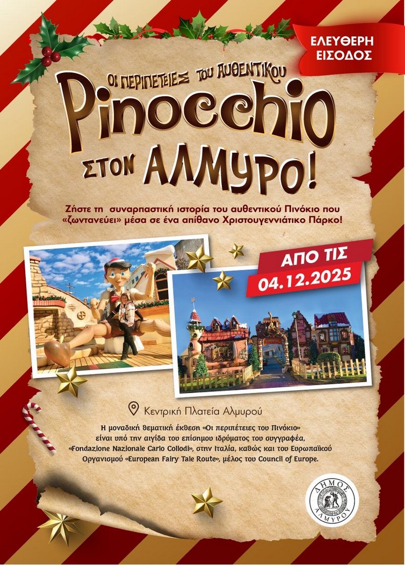 Ελάτε να ανάψουμε το Χριστουγεννιάτικο Δένδρο μας στην Κεντρική Πλατεία του Αλμυρού στις 7:00μμ. Θα παρακολουθήσουμε ένα πλούσιο μουσικό πρόγραμμα με την Νεανική – Παιδική χορωδία, τη Μικτή Τετράφωνη Χορωδία και το Φωνητικό Σύνολο του Δημοτικού Ωδείου Αλμυρού, υπό τη διεύθυνση της μαέστρου Μαριάννας Σαμαρτζή, της Καλλιτεχνικής διευθύντριας Φρόσως Γαρδικλή και των καθηγητών Γατή Αθανασίου στο σαξόφωνο και κλαρινέτο και του Κουσιόπουλου Δημητρίου στο φλάουτο. Η Φιλαρμονική ορχήστρα του Δήμου Αλμυρού υπό την καθοδήγηση της Μαρίας Αγγελή, θα μας χαρίσει χριστουγεννιάτικη μουσική διασχίζοντας τους δρόμους της πόλης μας από τις 6:00μμ. Ο Δήμαρχος Αλμυρού Δημήτριος Εσερίδης θα φωταγωγήσει το δένδρο! Τα παιδιά θα βιώσουν μια ολοκληρωμένη θεματική εμπειρία που ζωντανεύει την κλασική ιστορία του Πινόκιο στο θεματικό πάρκο, θα συναντήσουν αγαπημένους ήρωες.