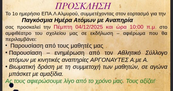 Το 1ο ημερήσιο ΕΠΑ.Λ Αλμυρού, συμμετέχοντας στον εορτασμό για την Παγκόσμια Ημέρα Ατόμων με Αναπηρία, διοργανώνει μια ξεχωριστή εκδήλωση-αφιέρωμα, με στόχο την ευαισθητοποίηση, την ενημέρωση και την προώθηση της ενσυναίσθησης. Σας προσκαλούμε όλους να παραβρεθείτε την Πέμπτη 04/12/2025 και ώρα 10:00 π.μ. στο αμφιθέατρο του σχολείου, για να αφιερώσουμε όλοι λίγο από τον χρόνο μας … Συνεχίστε να διαβάζετε το Εκδήλωση του ΕΠΑΛ Αλμυρού για την Παγκόσμια ημέρα ατόμων με αναπηρία.