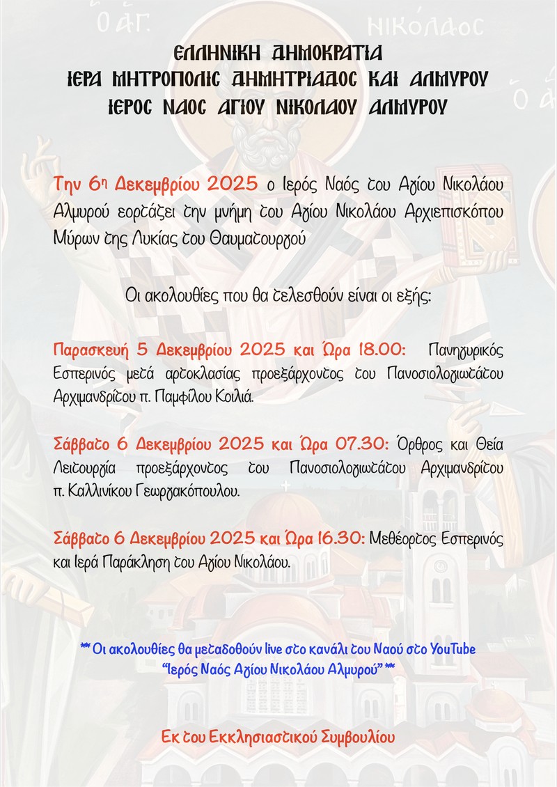 Το Σάββατο 6 Δεκεμβρίου 2025 ο Ιερός Ναός του Αγίου Νικολάου Αλμυρού εορτάζει την μνήμη του Αγίου Νικολάου Αρχιεπισκόπου Μύρων της Λυκίας του Θαυματουργού