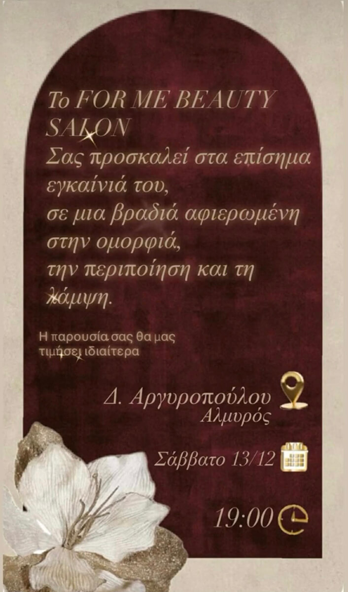 Το νέο FOR ME Beauty Salon ανοίγει επίσημα τις πόρτες του στον Αλμυρό και προσκαλεί το κοινό σε μια ιδιαίτερη βραδιά αφιερωμένη στην ομορφιά, την περιποίηση και τη χαλάρωση. Τα εγκαίνια θα πραγματοποιηθούν το Σάββατο 13 Δεκεμβρίου, στις 19:00, στη Δ. Αργυροπούλου.