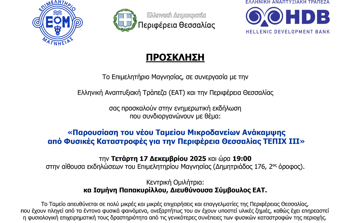 Το Επιμελητήριο Μαγνησίας, σε συνεργασία με την Ελληνική Αναπτυξιακή Τράπεζα (ΕΑΤ) και την Περιφέρεια Θεσσαλίας σας προσκαλούν στην ενημερωτική εκδήλωση που συνδιοργανώνουν με θέμα: