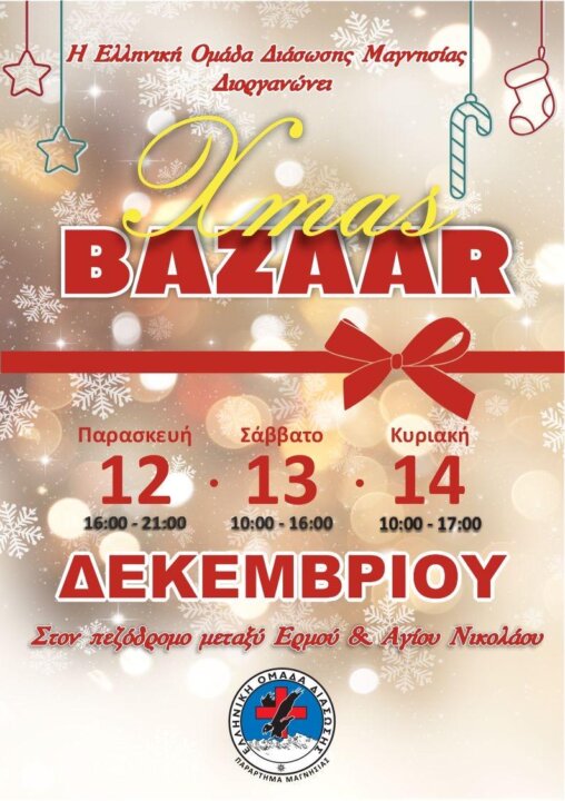 Η Ελληνική Ομάδα Διάσωσης Μαγνησίας διοργανώνει και φέτος το καθιερωμένο Χριστουγεννιάτικο Bazaar της, ένα τριήμερο γεμάτο εορταστική ατμόσφαιρα, χειροποίητες δημιουργίες και δράσεις για μικρούς και μεγάλους.