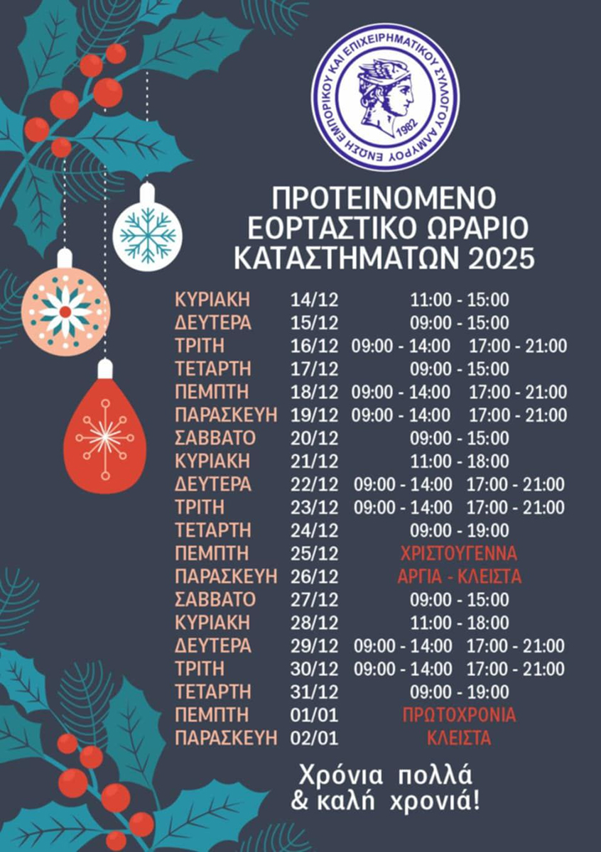 Το προτεινόμενο εορταστικό ωράριο λειτουργίας των καταστημάτων για το 2025