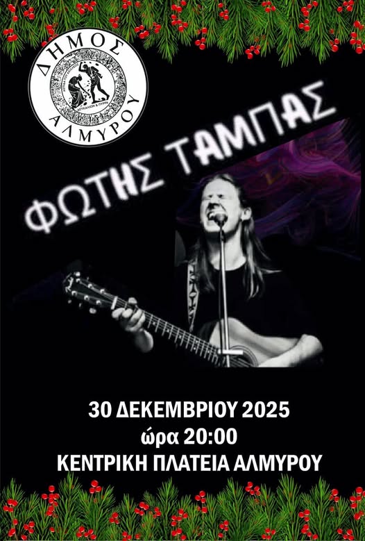 Η τελευταία συναυλία της χρονιάς για τον Αλμυρό προγραμματίζεται την Τρίτη 30 Δεκεμβρίου στην κεντρική πλατεία Αλμυρού με τον Φώτη Τάμπα και την ορχήστρα του. Ελάτε να απολαύσουμε γνωστά τραγούδια του Φώτη Τάμπα, του ελληνικού και του ξένου πενταγράμμου, λίγα 24ωρα πριν την εκπνοή του χρόνου.