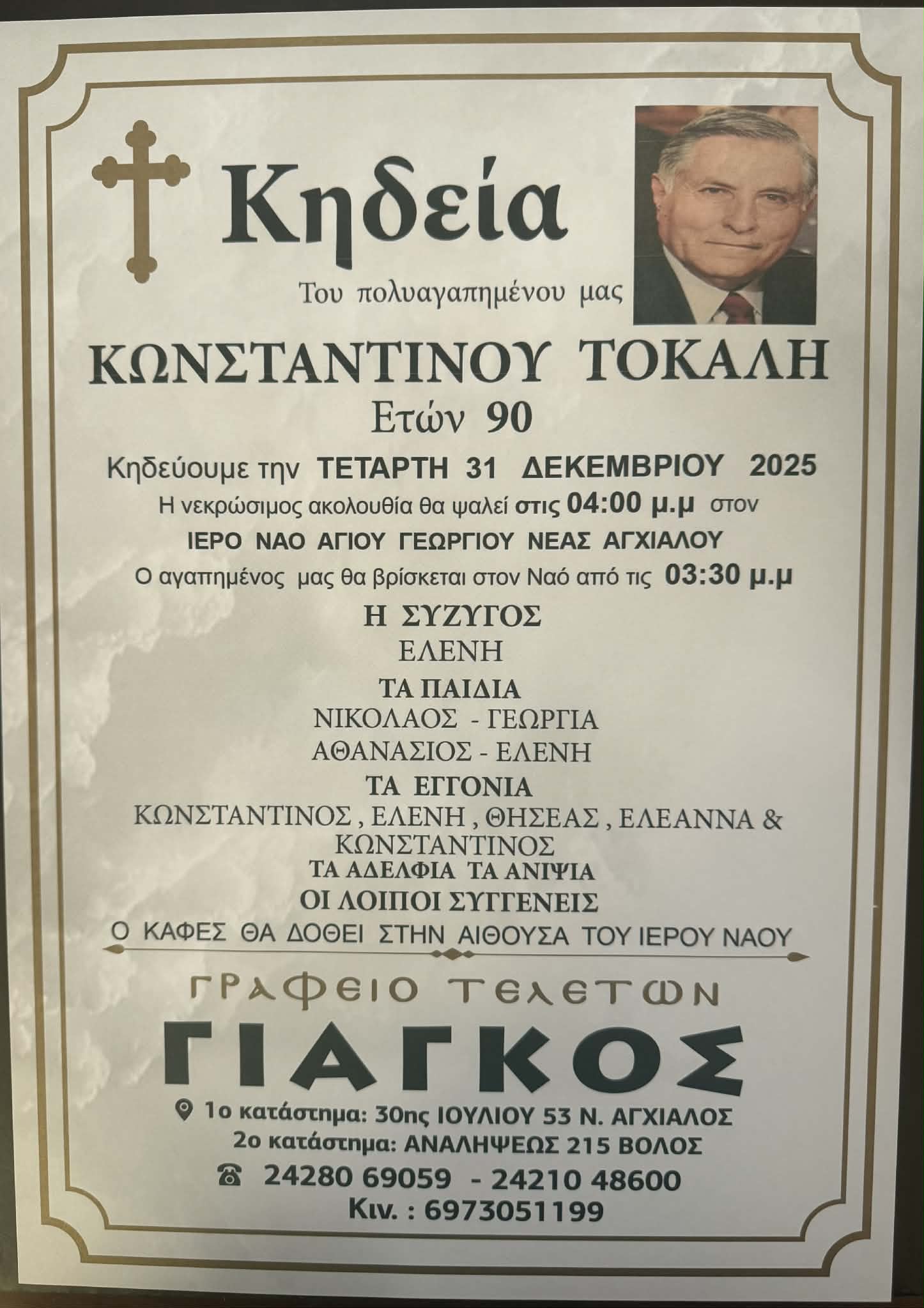 Τοπικά 30 Δεκεμβρίου, 2025 ΚΗΔΕΙΑ ΚΩΝΣΤΑΝΤΙΝΟΥ ΤΟΚΑΛΗ Σε ηλικία 90 ετών έφυγε από την ζωή ο Κωνσταντίνος Τοκαλής. Η εξόδιος ακολουθία θα γίνει στον Ιερό Ναό Αγίου Γεωργίου Νέας Αγχιάλου την Τετάρτη 31 Δεκεμβρίου στις 4μ.μ.