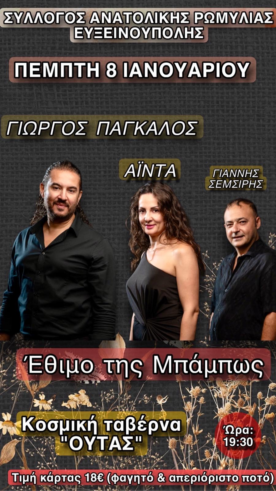 Το νέο έτος ανοίγει με το έθιμο της Μπάμπως στην καθιερωμένη εκδήλωση του Συλλόγου Ανατολικής Ρωμυλίας Ευξεινούπολης. Η εκδήλωση θα λάβει χώρα την Πέμπτη 8 Ιανουαρίου και ώρα 19:30 στην ταβέρνα Ούτας, ενώ ο Γιώργος Πάγκαλος και η Αΐντα θα φροντίσουν για το μουσικό πρόγραμμα και τη διασκέδαση των παρευρισκομένων. Από το δ.σ. του Συλλόγου απευθύνεται κάλεσμα σε μέλη και φίλους ώστε να τιμήσουν με την παρουσία τους την αναβίωση του εθίμου.