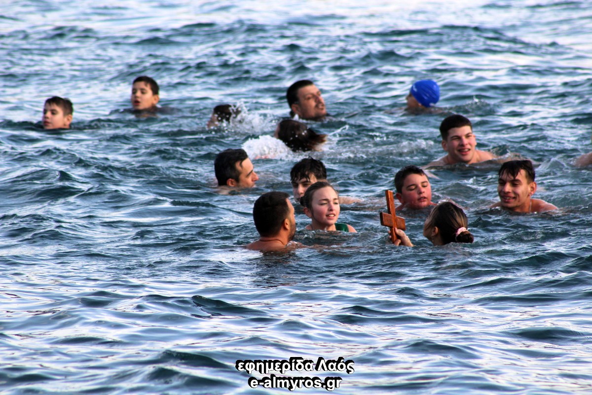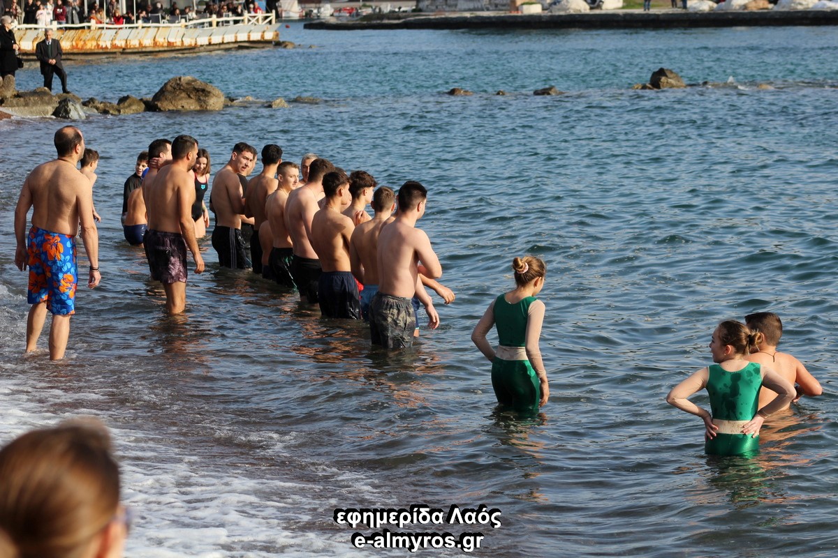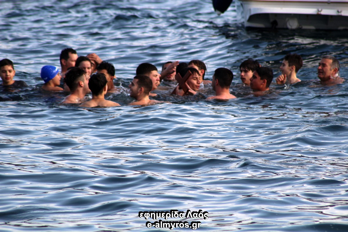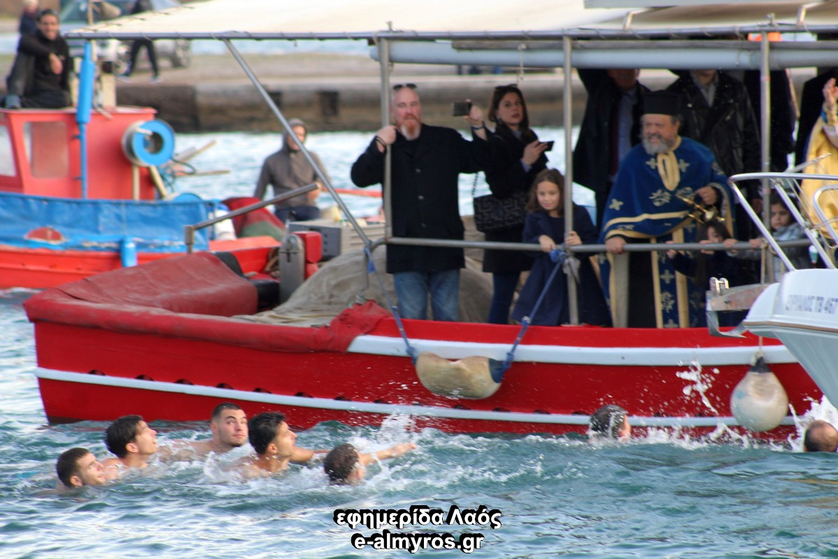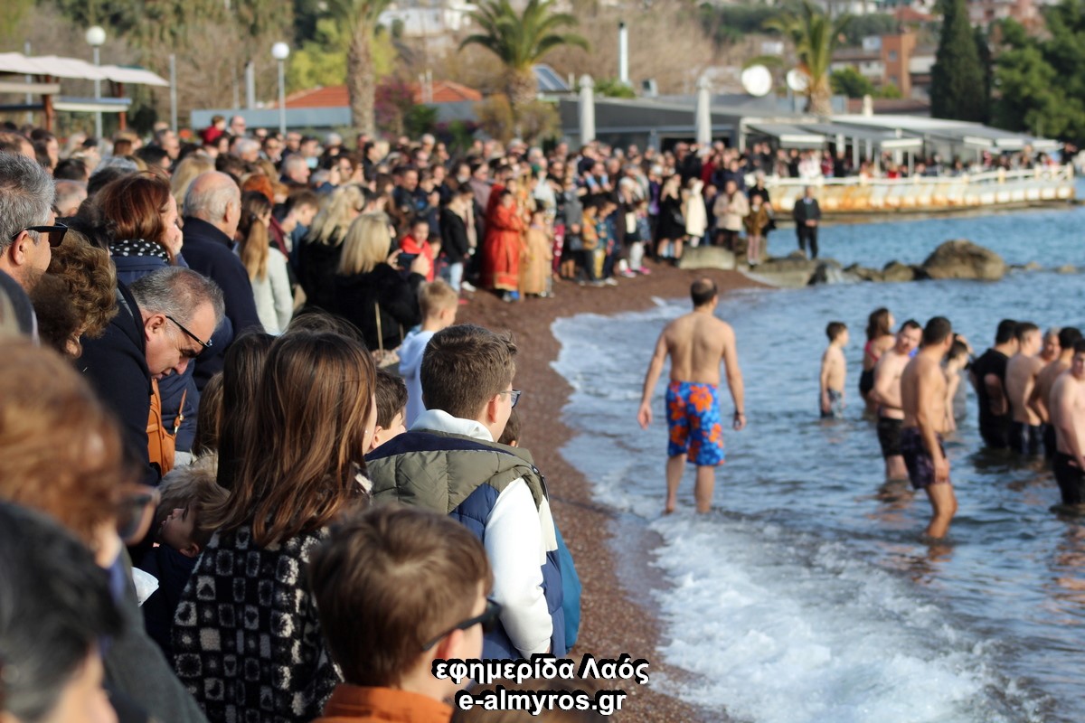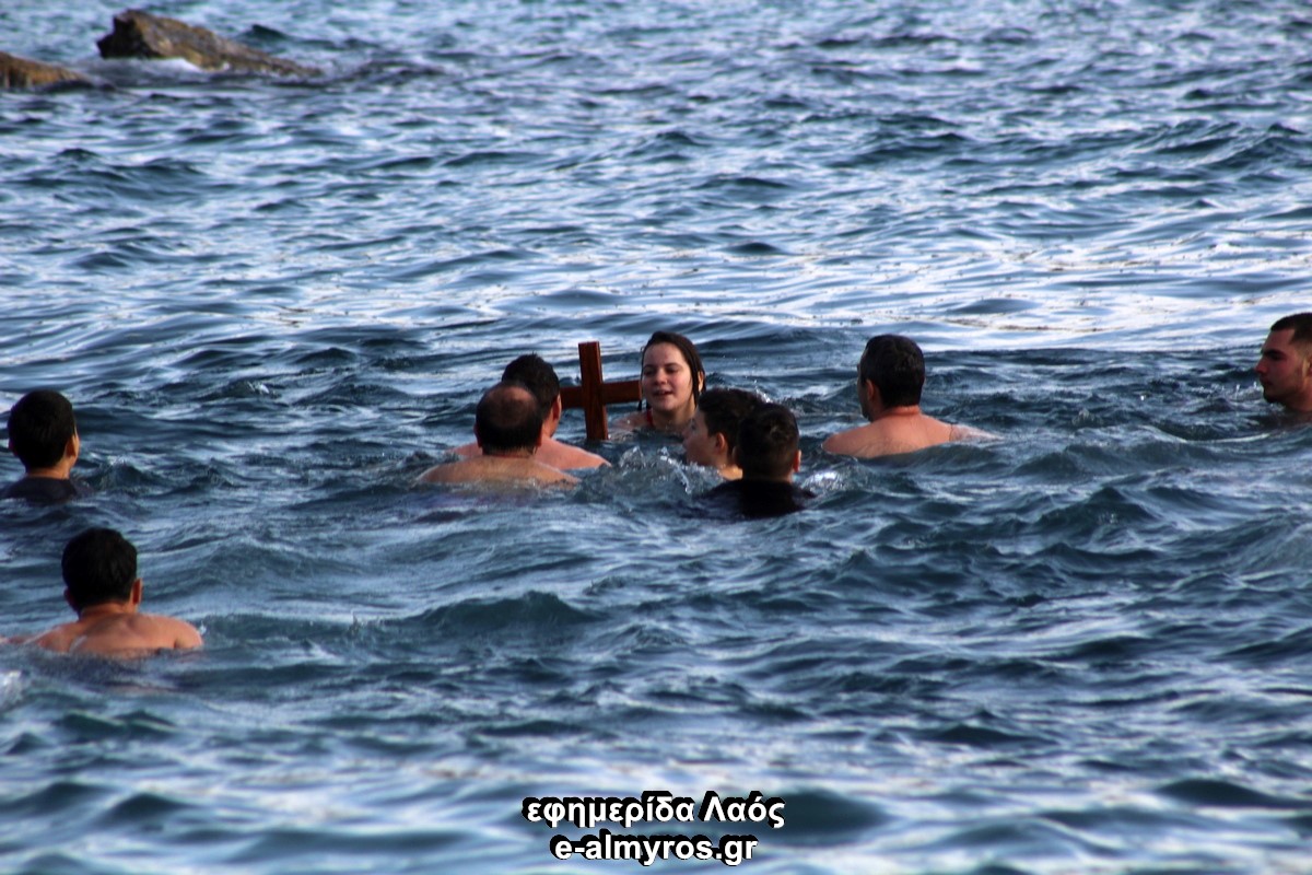Από εκεί έριξαν τρεις φορές τον Σταυρό στη θάλασσα όπως ορίζει η παράδοση και το τελετουργικό. Μετρήσαμε περίπου 30 άτομα κάθε ηλικίας, από μικρά παιδιά Δημοτικού μέχρι ενήλικες, που αψήφησαν το κρύο και έπεσαν στα κρύα νερά. Ήταν περισσότεροι από κάθε άλλη φορά! Ιδιαίτερη μνεία θα κάνουμε για τα τέσσερα κοριτσάκια που βούτηξαν να πιάσουν τον σταυρό, μάλιστα το ένα εξ αυτών τον έπιασε πρώτη στην πρώτη κατάδυση.