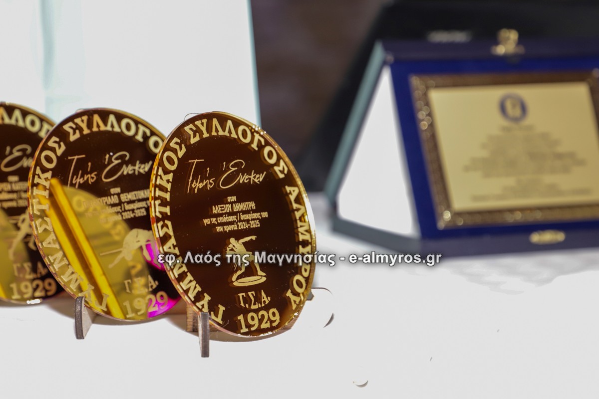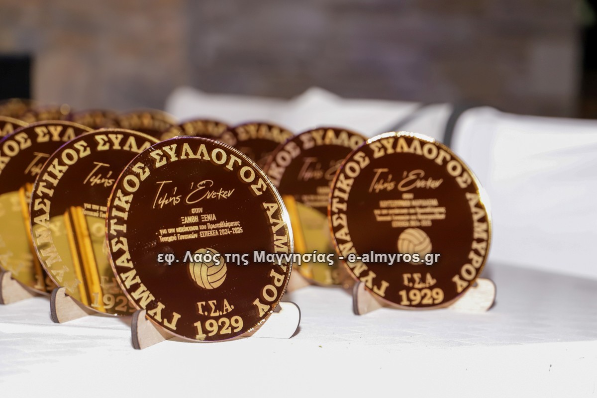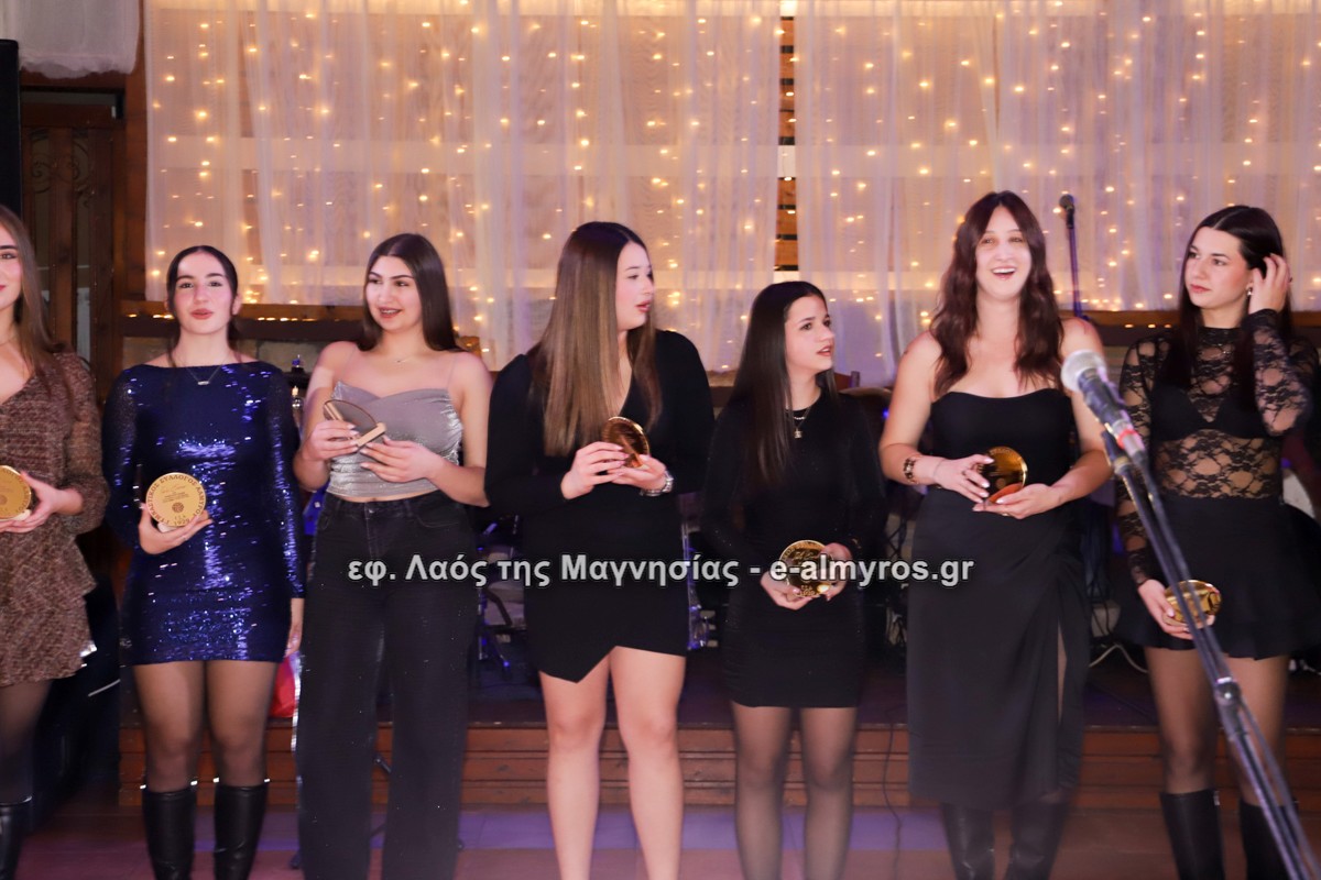 Ακολούθησαν οι βραβεύσεις. Τιμήθηκαν οι αθλήτριες των ομάδων βόλεϊ Γυναικών και Παγκορασίδων που κατέκτησαν την περασμένη σεζόν τίτλους στα πρωταθλήματά τους και οι αθλητές του στίβου με διακρίσεις σε διασυλλογικούς και πανελλήνιους αγώνες: Αλεξίου Δημήτρης, Παπακύριλος Θεμιστοκλής, Παρίσης Ευάγγελος, Παρίση Κατερίνα, Παππά Ελεάννα. Ιδιαίτερη στιγμή όταν η Χάιδω Καραπτσιά, η «μητέρα» του στίβου εδώ και δύο δεκαετίες έλαβε τιμητική πλακέτα από τους αθλητές της για την μεγάλη της προσφορά στον αθλητισμό της πόλης. Επίσης, τιμητική πλακέτα δόθηκε στον πρώτο πολίτη του Αλμυρού κο Εσερίδη.
