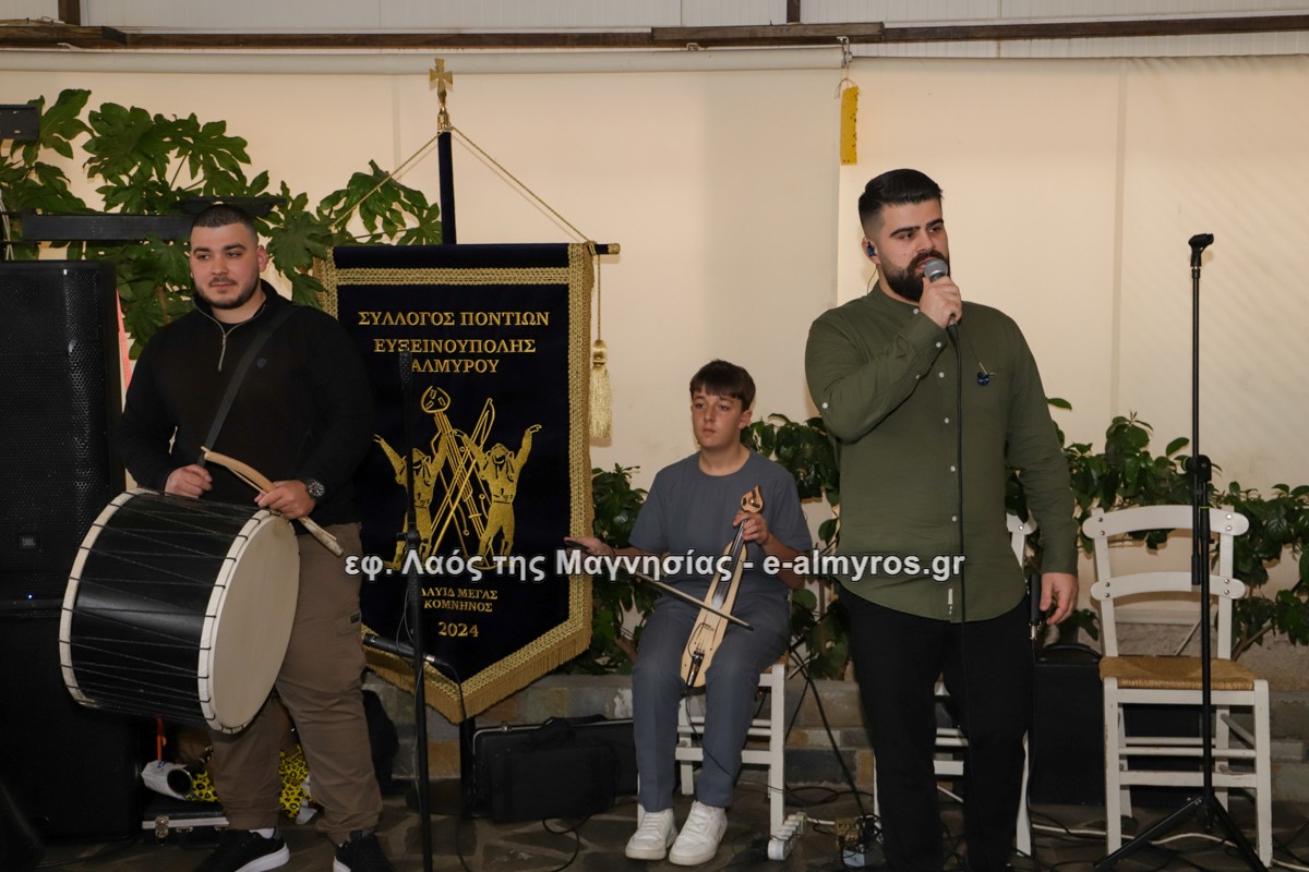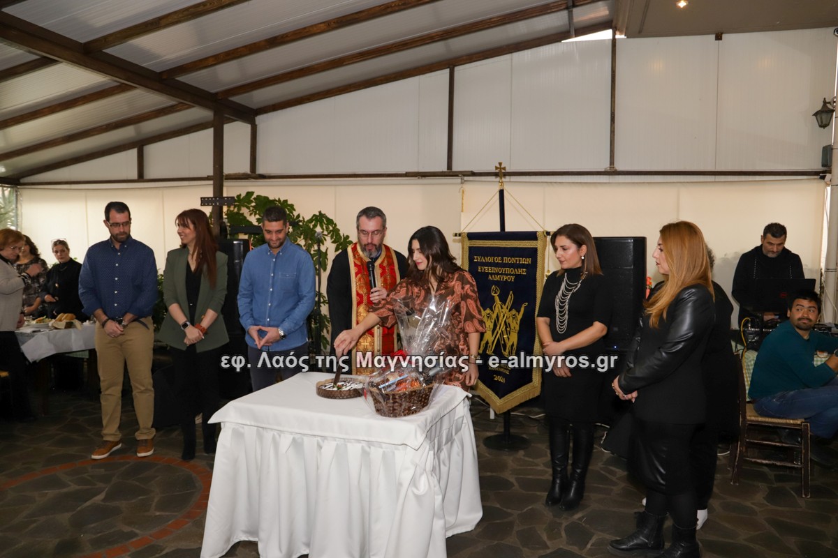 Στην ψησταριά “ο Νικόλας” στην Ευξεινούπολη πραγματοποιήθηκε η κοπή πίτας του Συλλόγου Ποντίων Ευξεινούπολης – Αλμυρού Δαυίδ Μέγας Κομνηνός την Κυριακή 11 Ιανουαρίου. Στην εκδήλωση παρευρέθησαν πολλά μέλη ποντιακών συλλόγων της Μαγνησίας, αλλά και από άλλες περιοχές της Ελλάδος. Χαιρετισμούς απηύθυναν εκτός της προέδρου κας Ευσταθίας Χαρτοματσίδου, ο Δήμαρχος Αλμυρού κ. Εσερίδης, ο Πρόεδρος της Ευξεινούπολης κ. Παπαγιάννης, ο βουλευτής Μαγνησίας και τέως υφυπουργός κ. Μπουκώρος, ενώ παρευρέθηκε και η βουλευτής Μαγνησίας και τέως υφυπουργός κα Ζέττα Μακρή. Οι χοροί κράτησαν για ώρες όπως άλλωστε κάθε φορά όταν το ποντιακό στοιχείο ενώνεται σε κυκλωτικούς χορούς και ξεχειλίζει η περηφάνια και ο δυναμισμός για επιβίωση και δημιουργία που χαρακτηρίζει τους πόντιους. Ο χοροδιδάσκαλος κ. Αθανασιάδης Αντώνης απόλαυσε ακόμη μια φορά τους μαθητές του να απολαμβάνουν την παράδοση και τους χορούς που έμαθαν, όπως και την ορχήστρα των Αντεκελίδη Κώστα στο νταούλι, Σωκράτη Μουρατίδη στη λύρα και το τραγούδι, Βαγενά Αντώνη στο κλαρίνο και την γκάιντα και τον Αθανασιάδη Νικόλα στη λύρα.