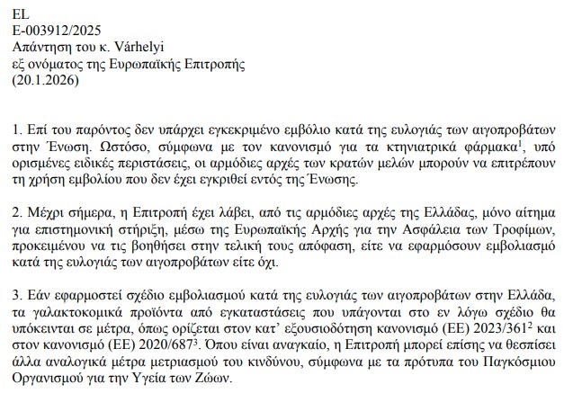 Από το ΥΠΑΑΤ λάβαμε και δημοσιεύουμε: Τέλος στην όποια παραπληροφόρηση σχετικά με τα δήθεν εγκεκριμένα εμβόλια για την ευλογιά έβαλε ο Υπουργός Αγροτικής Ανάπτυξης και Τροφίμων, Κώστας Τσιάρας στη Βουλή. Ο κ. Τσιάρας αποκάλυψε -και κατέθεσε στα πρακτικά- το περιεχόμενο της (21/01/2026) απάντησης του αρμόδιου Επιτρόπου Βάρχελι (μετά από ερώτηση του ευρωβουλευτή κ. Αρβανίτη). Συγκεκριμένα, ο κ. Βάρχελι απαντά ρητά ότι «επί του παρόντος δεν υπάρχει εγκεκριμένο εμβόλιο κατά της ευλογιάς των αιγοπροβάτων στην Ευρωπαϊκή Ένωση».