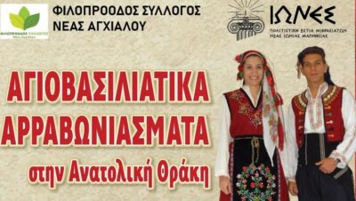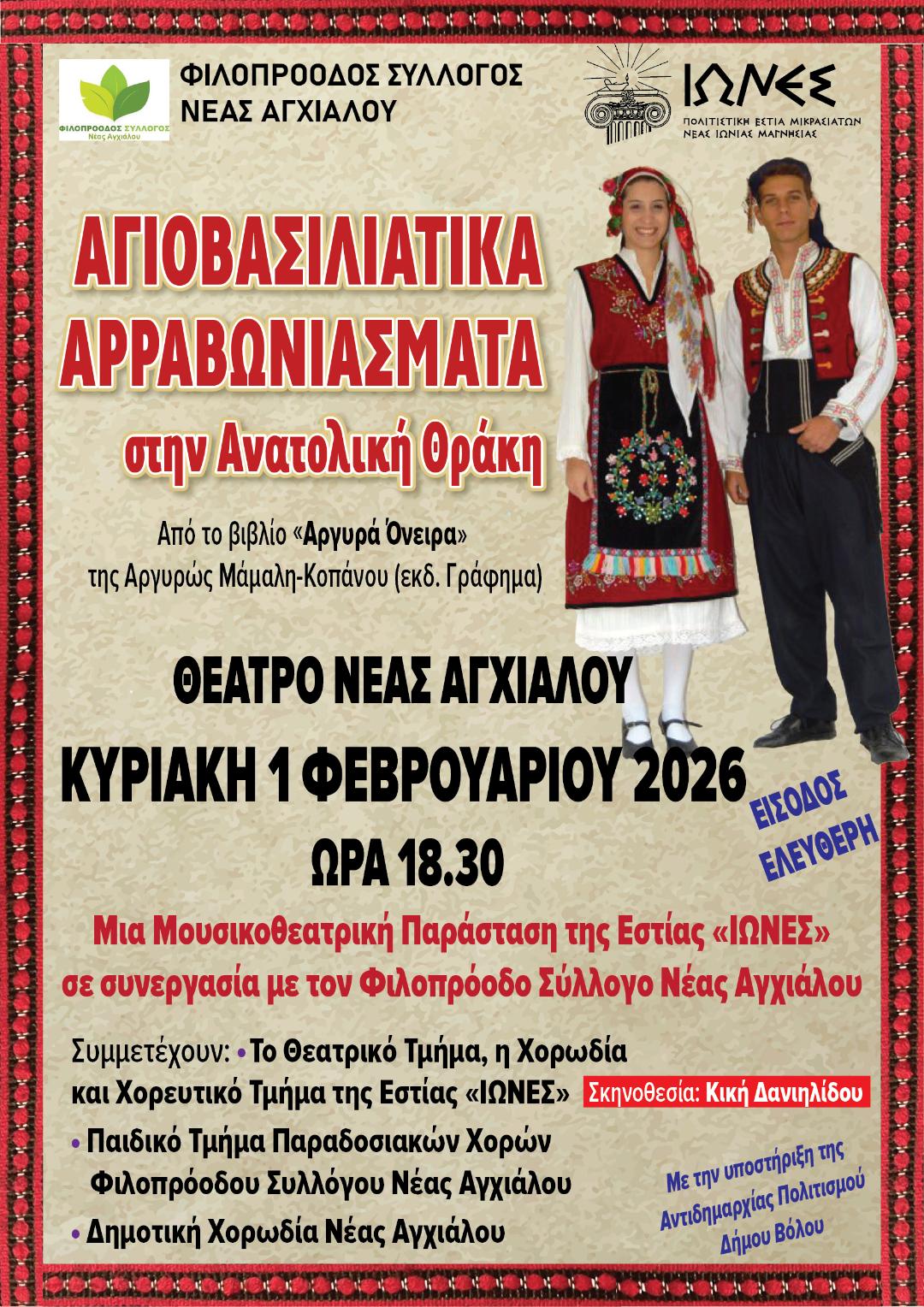 Πολιτιστική σύμπραξη μεταξύ του Φιλοπρόοδου Συλλόγου Νέας Αγχιάλου και της Πολιτιστικής Εστίας Μικρασιατών Νέας Ιωνίας “Ίωνες”. Το απόγευμα της Κυριακής 1ης Φεβρουαρίου στο αμφιθέατρο Ν. Αγχιάλου θα παρουσιαστεί η μουσικοθεατρική παράσταση “Αγιοβασιλιάτικα Αρραβωνιάσματα στην Ανατολική Θράκη” με τη συμμετοχή του χορευτικού τμήματος, του θεατρικού και της χορωδίας των “Ιώνων”, του παιδικού τμήματος παραδοσιακών χορών του Φιλοπρόοδου και της χορωδίας Ν. Αγχιάλου.
