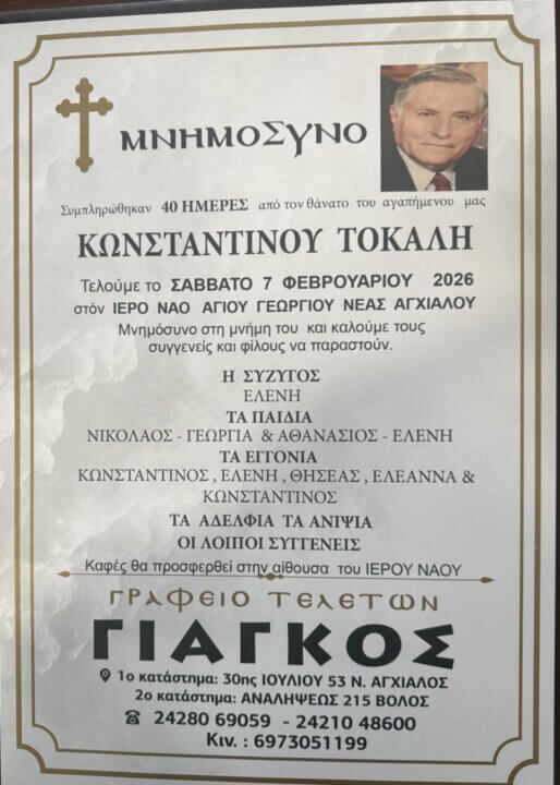 Την Κυριακή 8 Μαρτίου 2026, στον Ιερό Ναό Αγίων Αποστόλων Κωφών, θα τελεστεί το 40ήμερο μνημόσυνο…