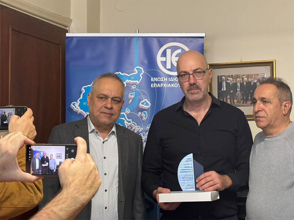 Ο Ταμίας της ΕΙΕΤ Άγγελος Βασίλαινας απένειμε την τιμητική πλακέτα στον Άκη Θεοφανίδη, γιο του Ιωάννη.