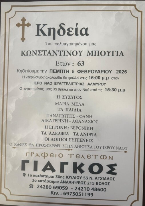 • ΚΗΔΕΙΑ ΚΩΝΣΤΑΝΤΙΝΟΥ ΜΠΟΥΓΙΑ 4 Φεβρουαρίου, 2026