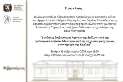 Εκδήλωση ιστορικού-αρχαιολογικού ενδιαφέροντος θα πραγματοποιηθεί το απόγευμα της Τετάρτης 18 Φεβρουαρίου στον Βόλο. Ειδικότερα, στις 18:30 στην αίθουσα εκδηλώσεων του ξενοδοχείου Παρκ ο κος Δημήτρης Αγνουσιώτης, αρχαιολόγος της Εφορείας Αρχαιοτήτων Μαγνησίας, θα παρουσιάσει ομιλία σχετικά με τις «συνθήκες διαβίωσης σε λιμναίο περιβάλλον κατά την προϊστορική περίοδο. Μαρτυρίες από τις ανασκαφικές έρευνες στην περιοχή της Κάρλας». Διοργανωτές της ημερίδας αυτής είναι το σωματείο “Φίλοι Αθανασάκειου Αρχαιολογικού Μουσείου Βόλου και Αρχαιολογικών Χώρων Μαγνησίας και Β. Σποράδων” και η Εφορεία Αρχαιοτήτων, στο πλαίσιο του κύκλου διαλέξεων. Θα παρουσιαστούν τα ανασκαφικά ευρήματα που έχουν προκύψει από τις παλαιότερες και τις νεότερες έρευνες στην περιοχή της λίμνης Κάρλας και με βάση αυτά, θα αναδειχθούν μερικές πτυχές από την καθημερινή ζωή των ανθρώπων κατά τους προϊστορικούς χρόνους όπως μάς ανέφερε ο κος Αγνουσιώτης.