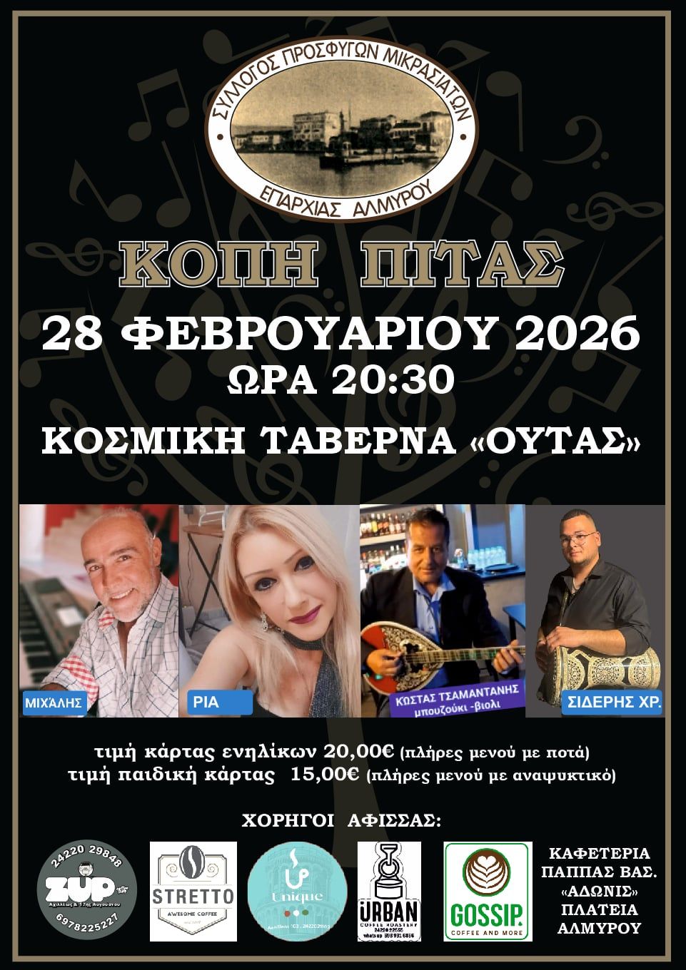Ο Σύλλογος Προσφύγων Μικρασιατών επαρχίας Αλμυρού καλεί μέλη και φίλους στην ετήσια χοροεσπερίδα που θα πραγματοποιηθεί το Σάββατο 28 Φεβρουαρίου στην κοσμική ταβέρνα “Ούτας” στον Αλμυρό. Δείτε την αφίσα της εκδήλωσης: