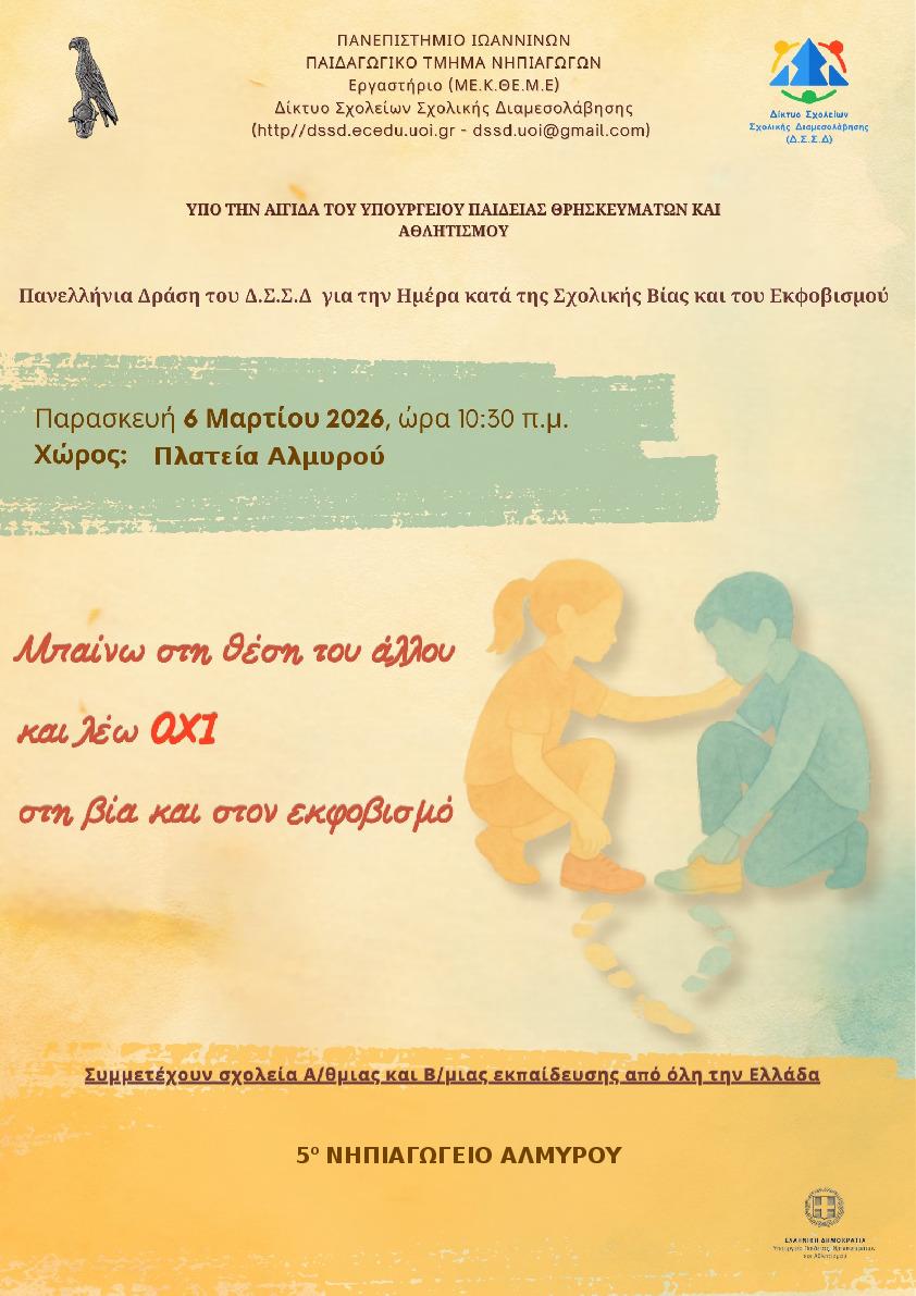Την Παρασκευή 6 Μαρτίου 2026 στις 10:30 π.μ., η πλατεία Αλμυρού θα γεμίσει με μηνύματα ενσυναίσθησης, αλληλεγγύης και σεβασμού. Μαθητές από σχολεία πρωτοβάθμιας και δευτεροβάθμιας εκπαίδευσης από κάθε γωνιά της Ελλάδας συντονίζονται την ίδια ημέρα, στέλνοντας ένα ηχηρό μήνυμα κατά του εκφοβισμού.