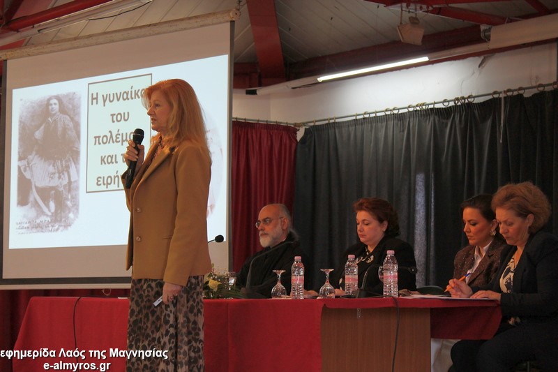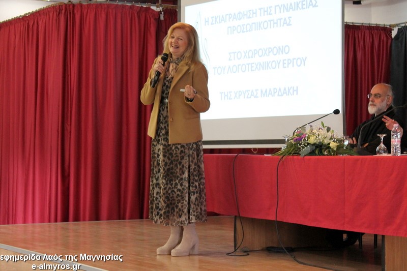 Η κοινωνιολόγος και συγγραφέας κα Χρύσα Μαρδάκη μίλησε για την γυναικεία παρουσία στο λογοτεχνικό της έργο …από την Αυτοκράτειρα Ευδοκία μέχρι πολεμίστριες του 1821 και του απελευθερωτικού αγώνα του Αλμυρού, ενώ απήγγειλε δύο ποιήματά της σχετικά με το θέμα.
