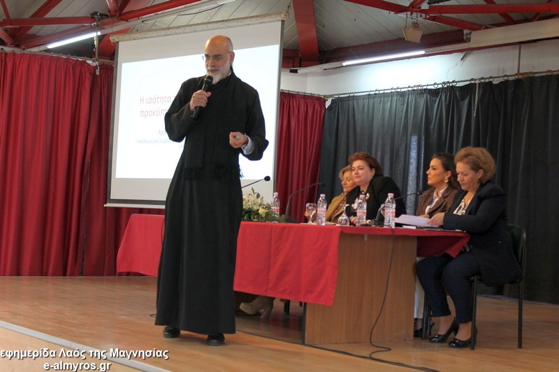 Πολύ παραστατικός και με μεγάλη αμεσότητα ήταν ο λόγος του πατέρα Σεβαστιανού Ζερβού ο οποίος είναι πρόεδρος της «Πρότασης Ζωής» και μεταξύ των άλλων, υπεύθυνος του Συμβουλευτικού Σταθμού της Μητρόπολης Δημητριάδος και Αλμυρού από το 2000. Μίλησε για την ισότητα των φύλων κατά την Αγία Γραφή και πως σε αυτά τα κείμενα φαίνεται ότι η γυναίκα είναι καθ’ όλα ίση με τον άνδρα, παρά το γεγονός ότι ορισμένα θρησκεύματα τα διαστρέβλωσαν για το δικό τους πατριαρχικό μοντέλο. Έκανε λόγο για την ανάγκη της αλληλοπεριχωρητικής συνύπαρξης στις σχέσεις, ενώ πρόσθεσε πως «η Χριστιανική διδασκαλία δίνει αξία στην προσωπικότητα της γυναίκας, την απελευθερώνει από την στρεβλωμένη επιβολή της κυριαρχίας του ανδρός και την ενισχύει στην αναζήτηση της δικαιοσύνης».