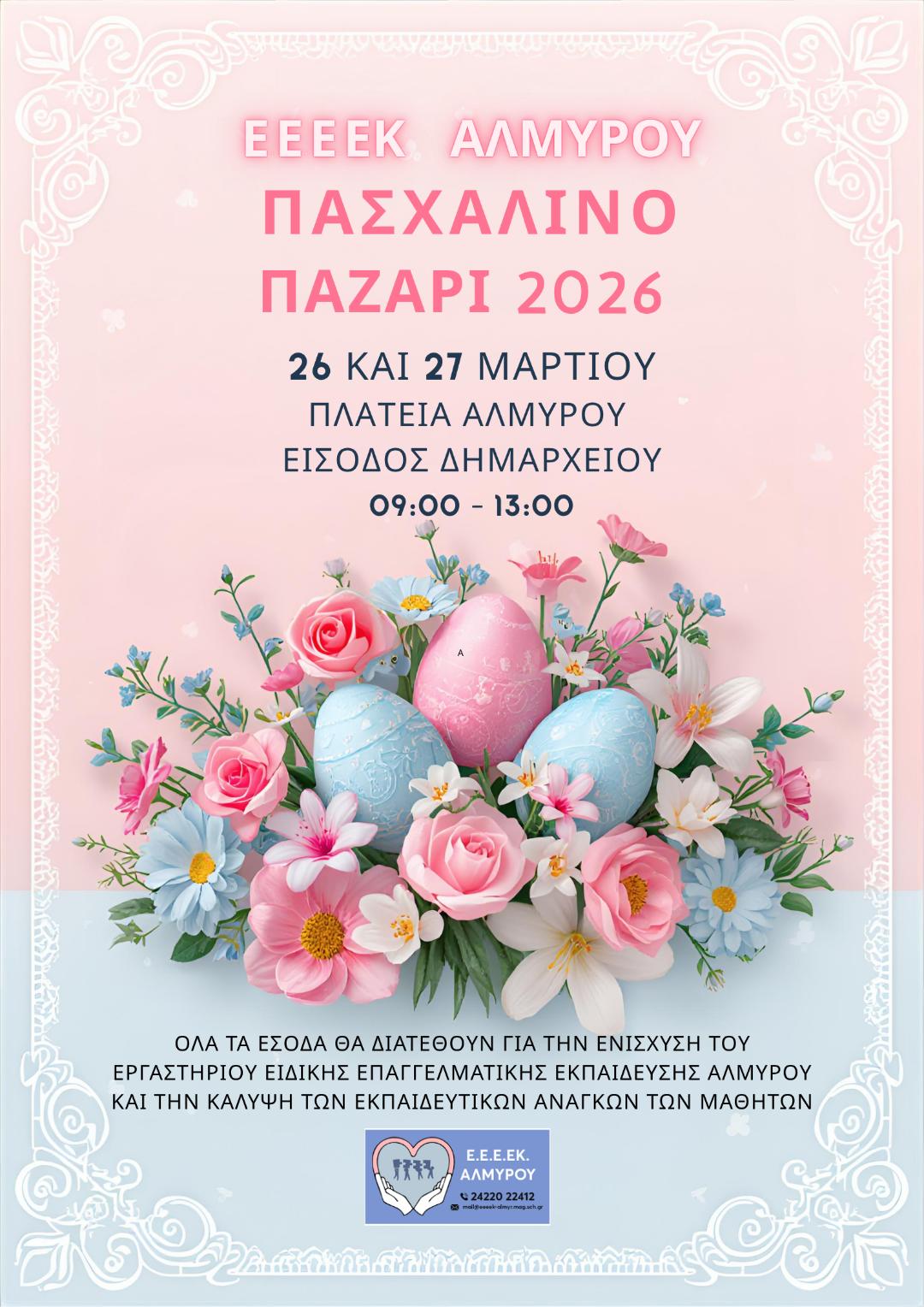 Διήμερο Πασχαλινό παζάρι διοργανώνει σήμερα Πέμπτη και αύριο Παρασκευή 27 Μαρτίου το ΕΕΕΕΚ Αλμυρού στην είσοδο του Δημαρχείου Αλμυρού. Όλα τα έσοδα θα διατεθούν για την ενίσχυση της σχολικής μονάδας και την κάλυψη αναγκών των μαθητών.