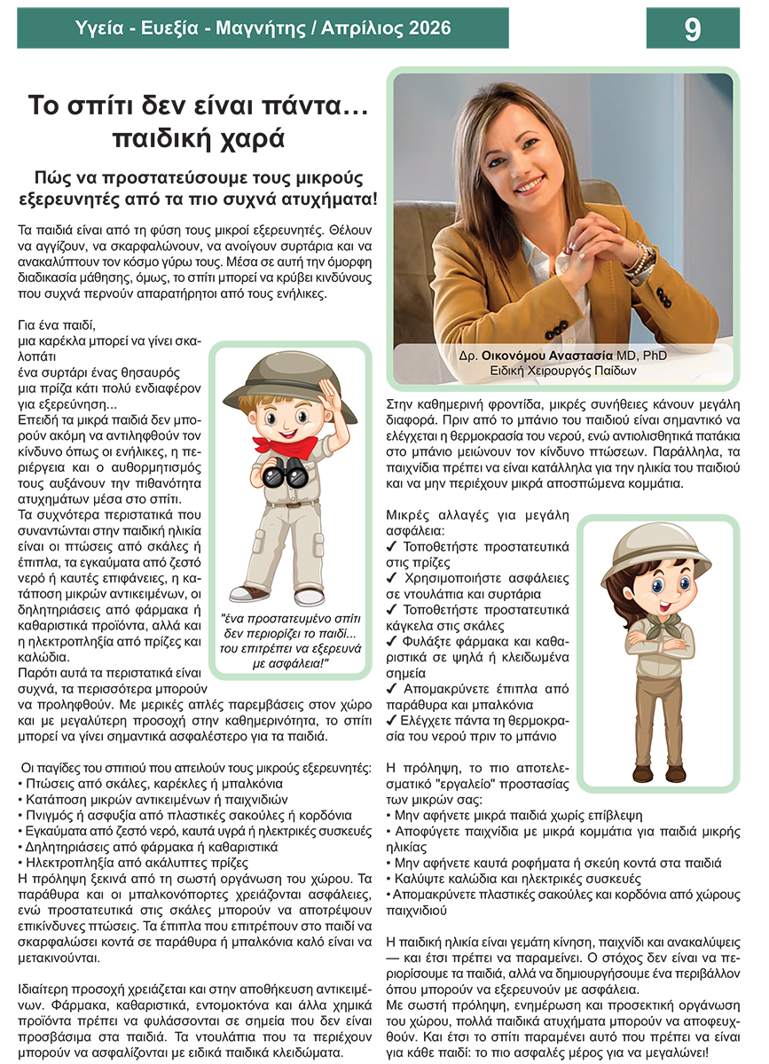 • Οικονόμου Αναστασία: Το σπίτι δεν είναι πάντα… παιδική χαρά: πώς να προστατεύσουμε τους μικρούς εξερευνητές από τα πιο συχνά ατυχήματα! 15 Απριλίου, 2026