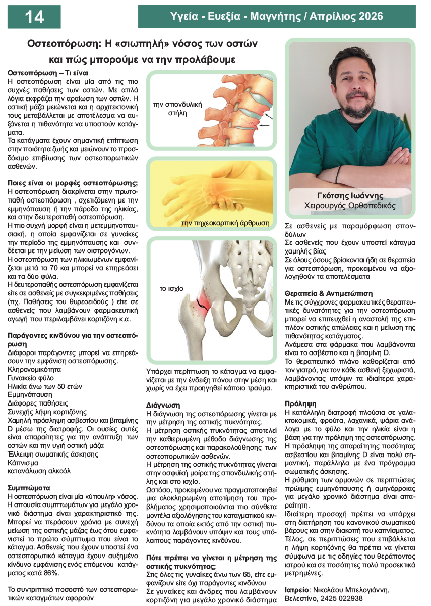Υγεία Ευεξία 20 Απριλίου, 2026 Γκότσης Ιωάννης : Οστεοπόρωση: Η «σιωπηλή» νόσος των οστών και πώς μπορούμε να την προλάβουμε Tags Γκότσης Ιωάννης περιοδικό υγεία ευεξία